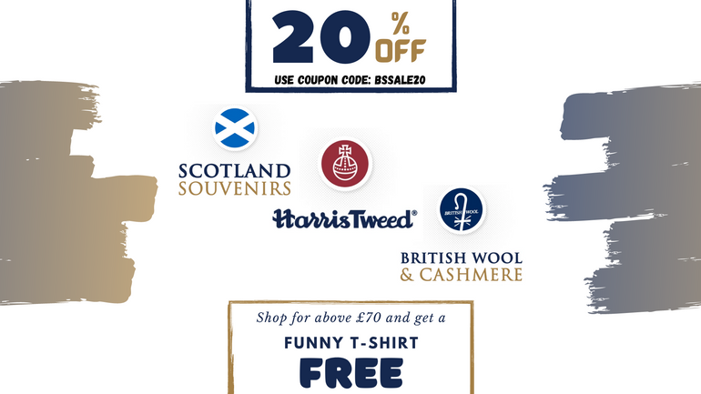 - You will get a special funny t-shirt as a gift on the purchase of above £70 for Scottish Souvenirs, Cashmere collections and Harris Tweed collections.