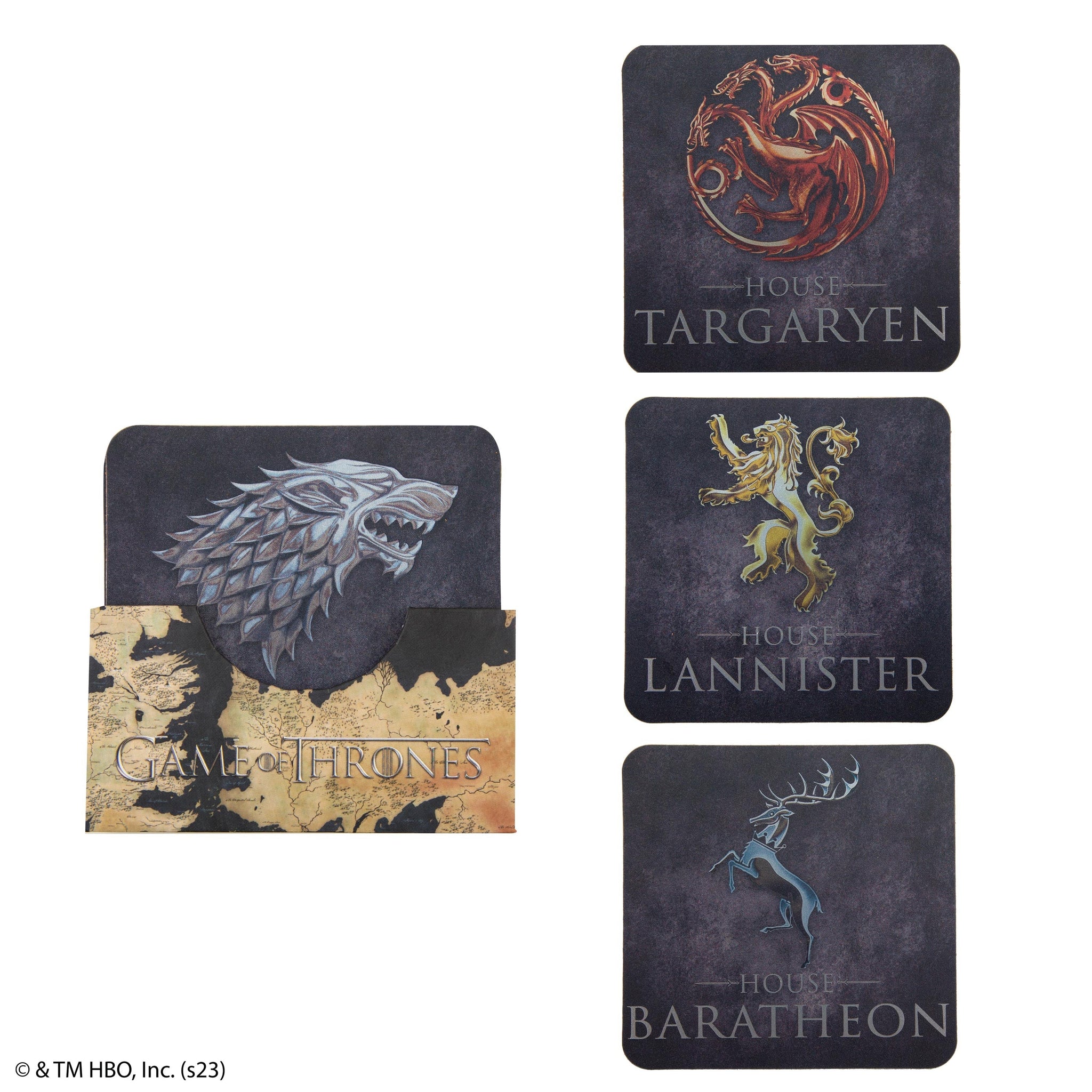 This set includes four beautifully crafted coasters featuring the house sigils of the four iconic houses from the beloved fantasy series, including House Stark, House Targaryen, House Lannister, and House Baratheon.