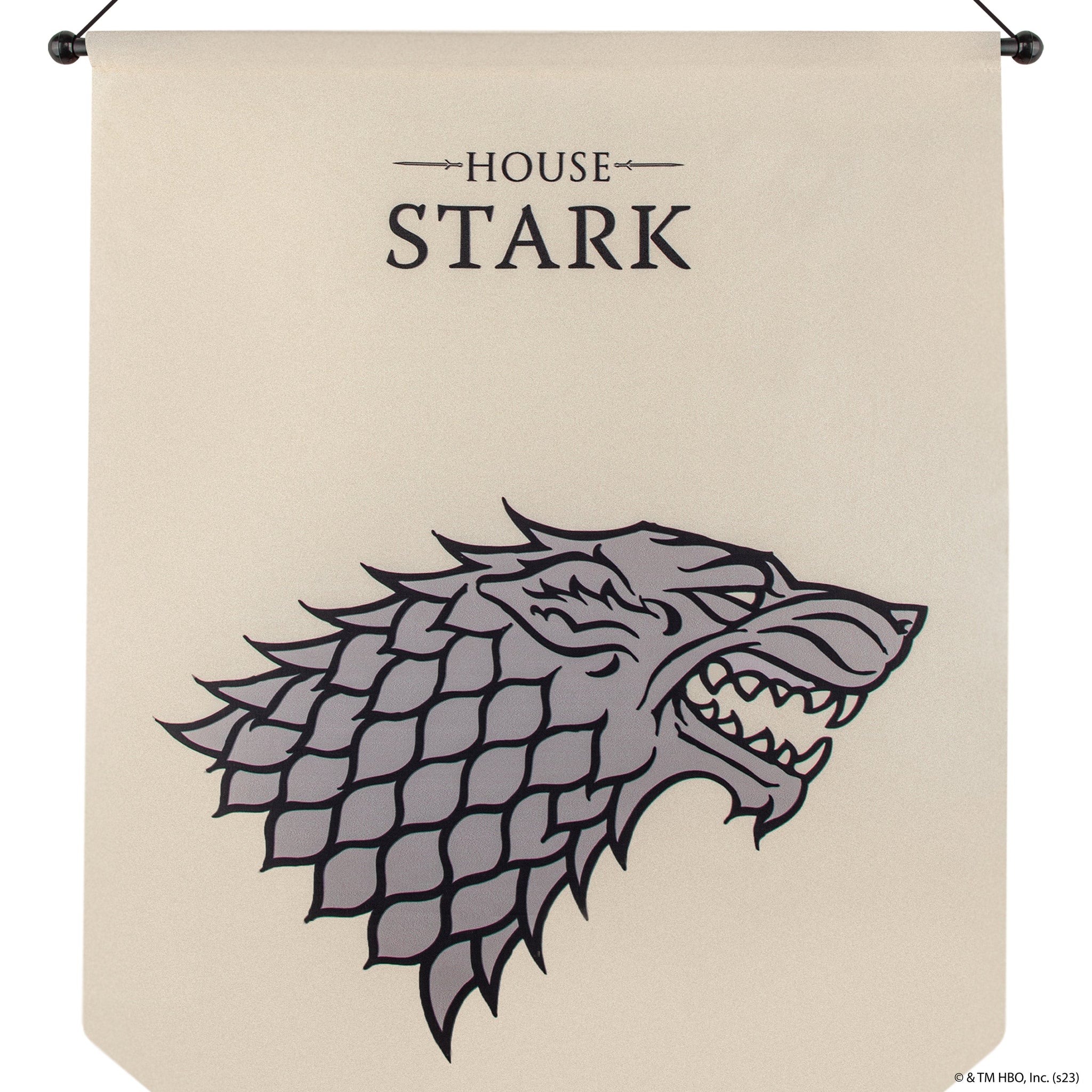 Wall banner to showcase which side you're taking in the battle between noble families of Westeros in the worldwide TV hit series, Game of Thrones. This wall banner is printed with the sigil of the great house Stark of Winterfell. It features a direwolf, a strong and loyal animal known to inhabit the North of Westeros.