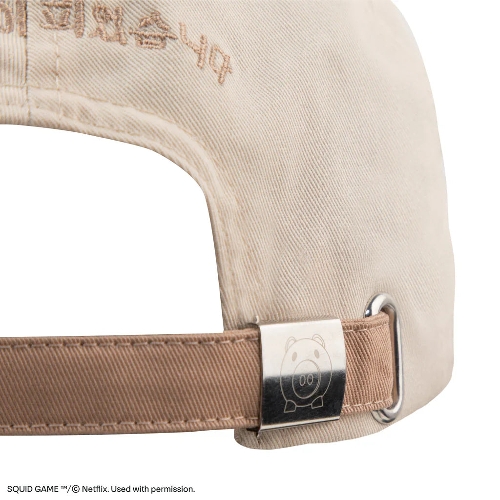 The cap showcases popular words from the series in striking green lettering and a vibrant red Young-hee at the bottom, contrasting with the soft beige background. Get yours now and be ready to enter the arena.