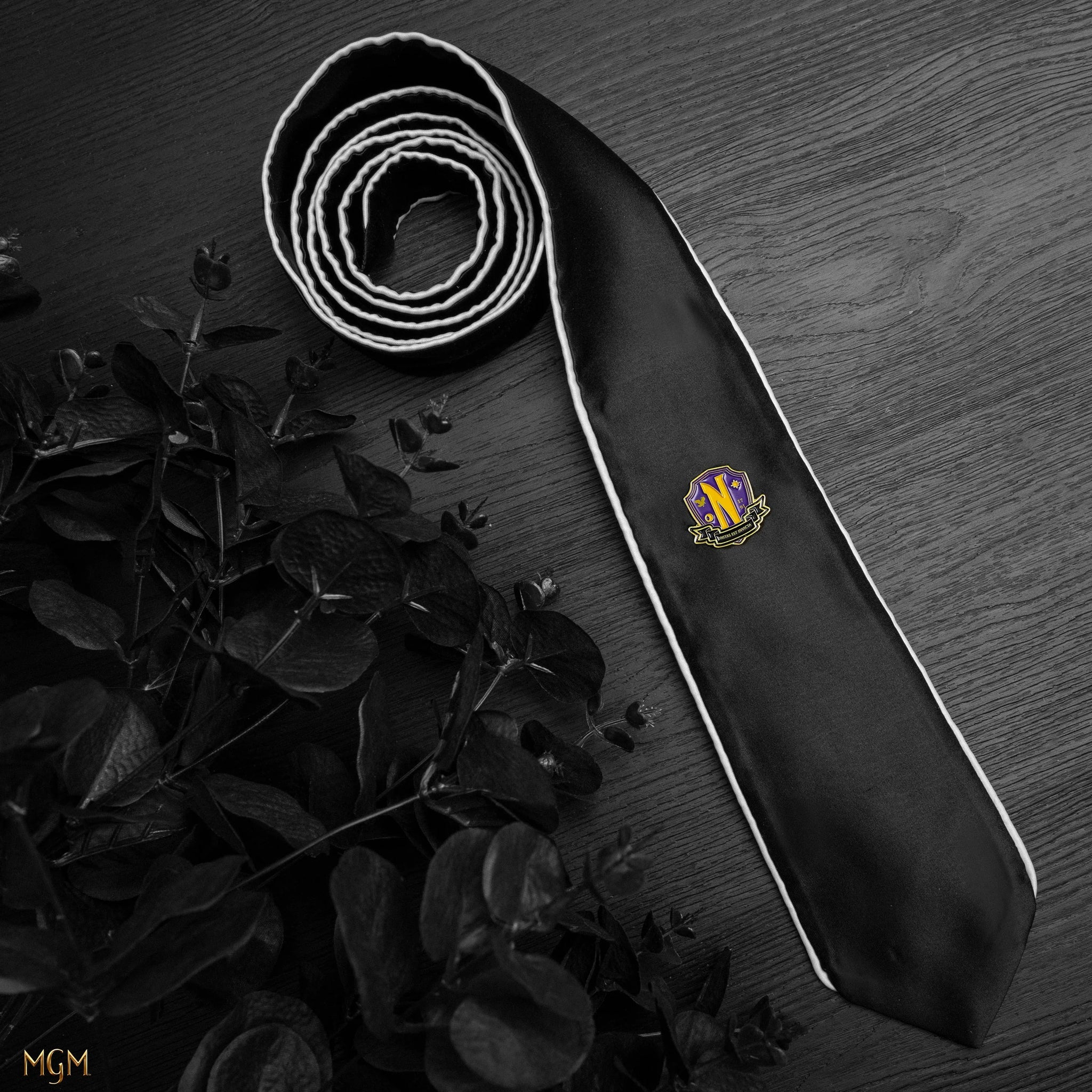 This tie and pin set is suitable for both costume and day-to-day use such as work. It features the exact same necktie from the Nevermore Academy uniform and  exudes a sense of dark sophistication that will captivate any Addams Family enthusiast.