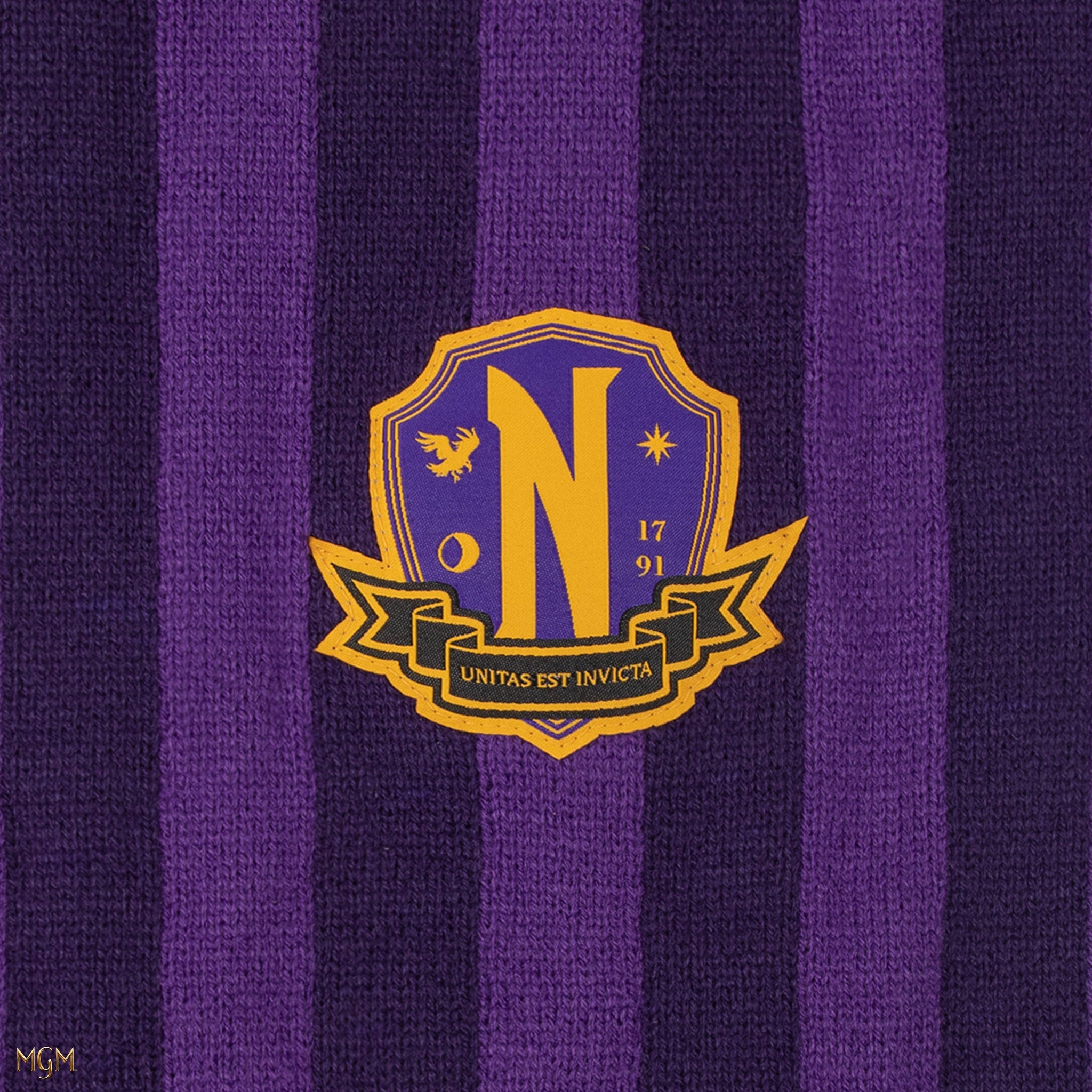 Keep warm and effortlessly cool with our purple Nevermore Academy scarf. It’s carefully chosen shades of purple make this hauntingly beautiful accessory the perfect addition to your wardrobe. At both ends of the scarf, you will find the iconic Nevermore Academy emblem, a symbol of the enigmatic institution.