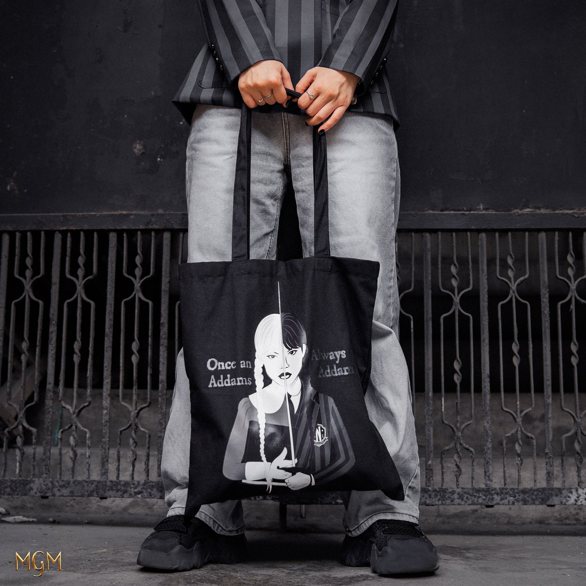 This tote bag features Wednesday Addams on one side and in the other one we have a mix of two halves between Wednesday and Goody Addams with the words "Once an Addams, always an...