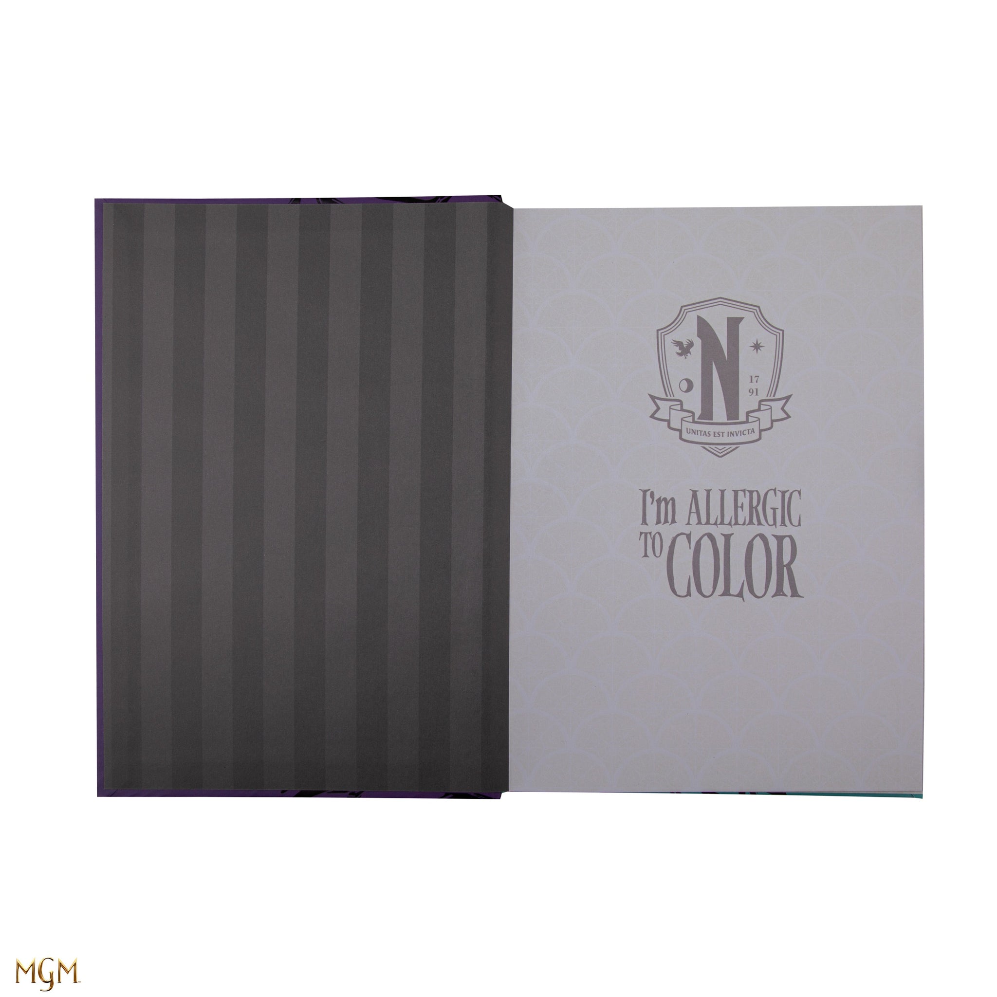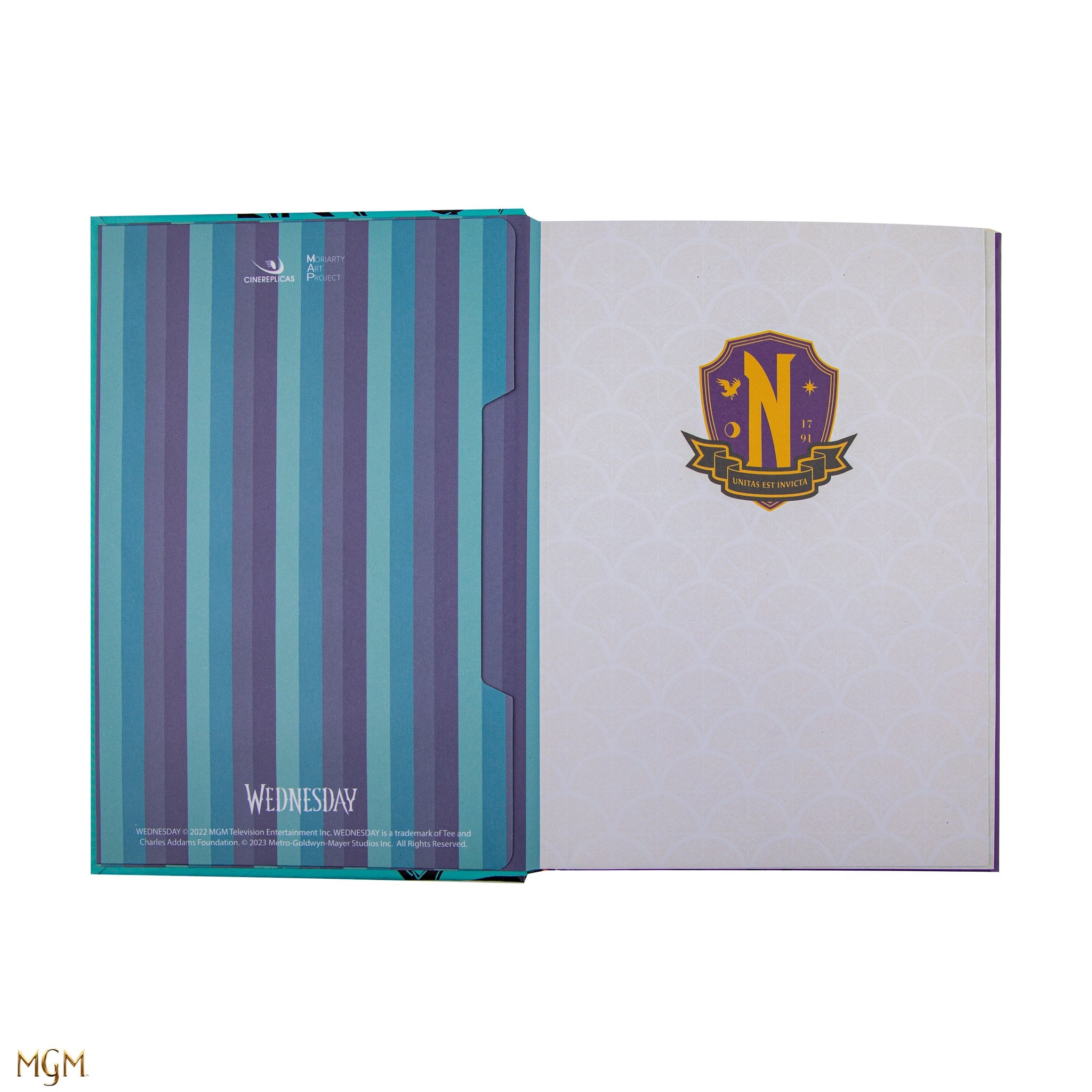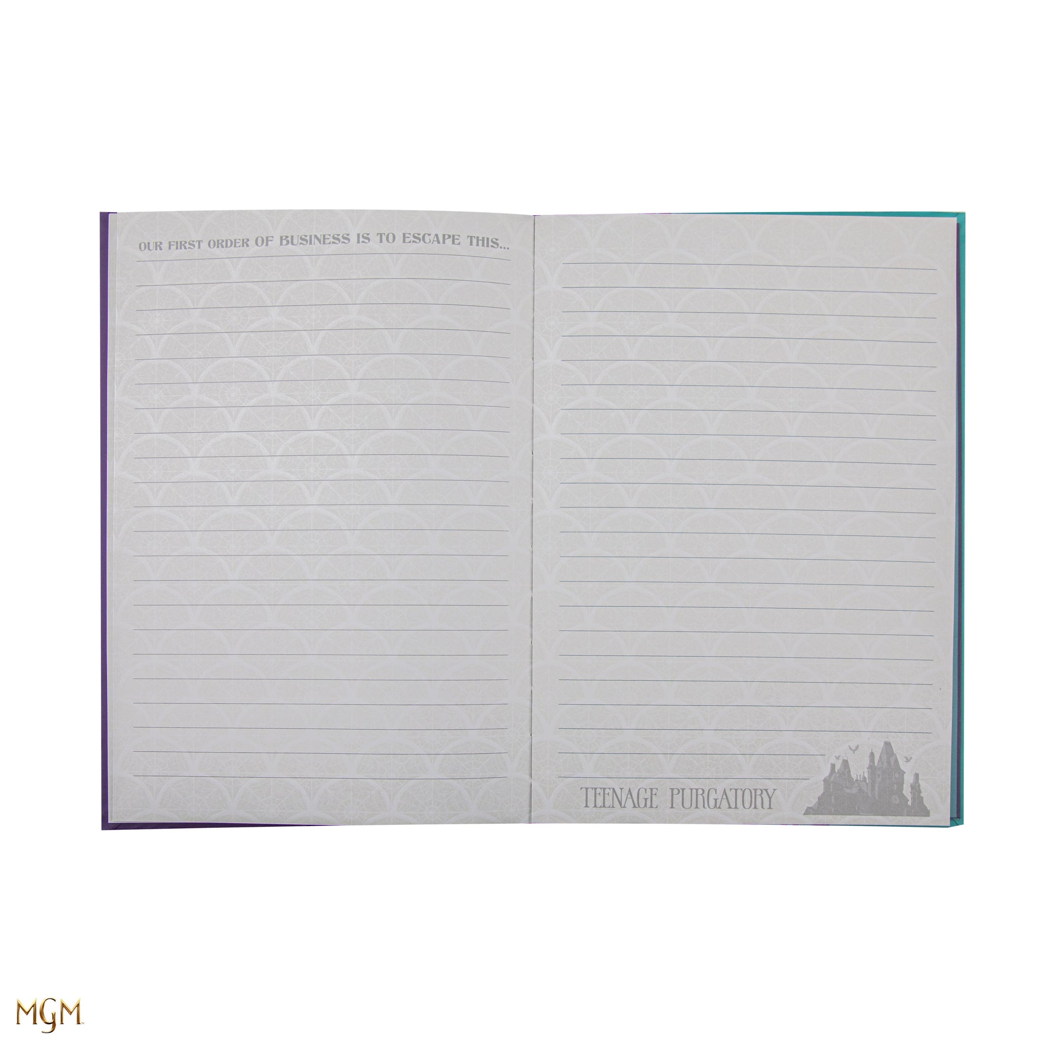 This notebook displays stunning side-profile illustrations of Wednesday and Enid in front of their respective sides of the stained glass window. And that's not all - you'll also find a blue and purple striped pocket at the back to help you store loose bits of paper. The hardcover construction and high-quality paper make it perfect for all your creative needs.